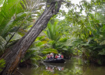 Ten thousand square miles of mangrove forest, bamboo, and sago palms have long sheltered the Asmat region from outsiders. At high tide, our ship enters the shallow channel of the Flamingo River to anchor near the village of Agats, the regional capital of the Asmat. A remote riverine world is revealed as Zodiacs carry you along narrow waterways lined with the entwined branches of thick mangrove forests, home to Torresian Imperial Pigeons, Sulphur-crested Cockatoos, and bright red lorikeets. As you make your way upstream, villagers – whooping and chanting in elaborate warrior gear and paint – paddle vigorously toward you in intricately carved canoes to escort you ashore where an enthusiastic welcome awaits. A walk along elevated wooden boardwalks leads to a cathedral with superb carvings, and museum with displays of ancestor poles, drums, body masks, shields, daggers, and skulls; a reminder that cannibalism and head-hunting was practiced by the ancestors of some villagers. Asmat woodcarvings are known for their powerful lines and coarse, expressive motifs, and are widely considered by collectors and scholars to be among the world’s finest carvings and can be purchased directly from the village artisans.